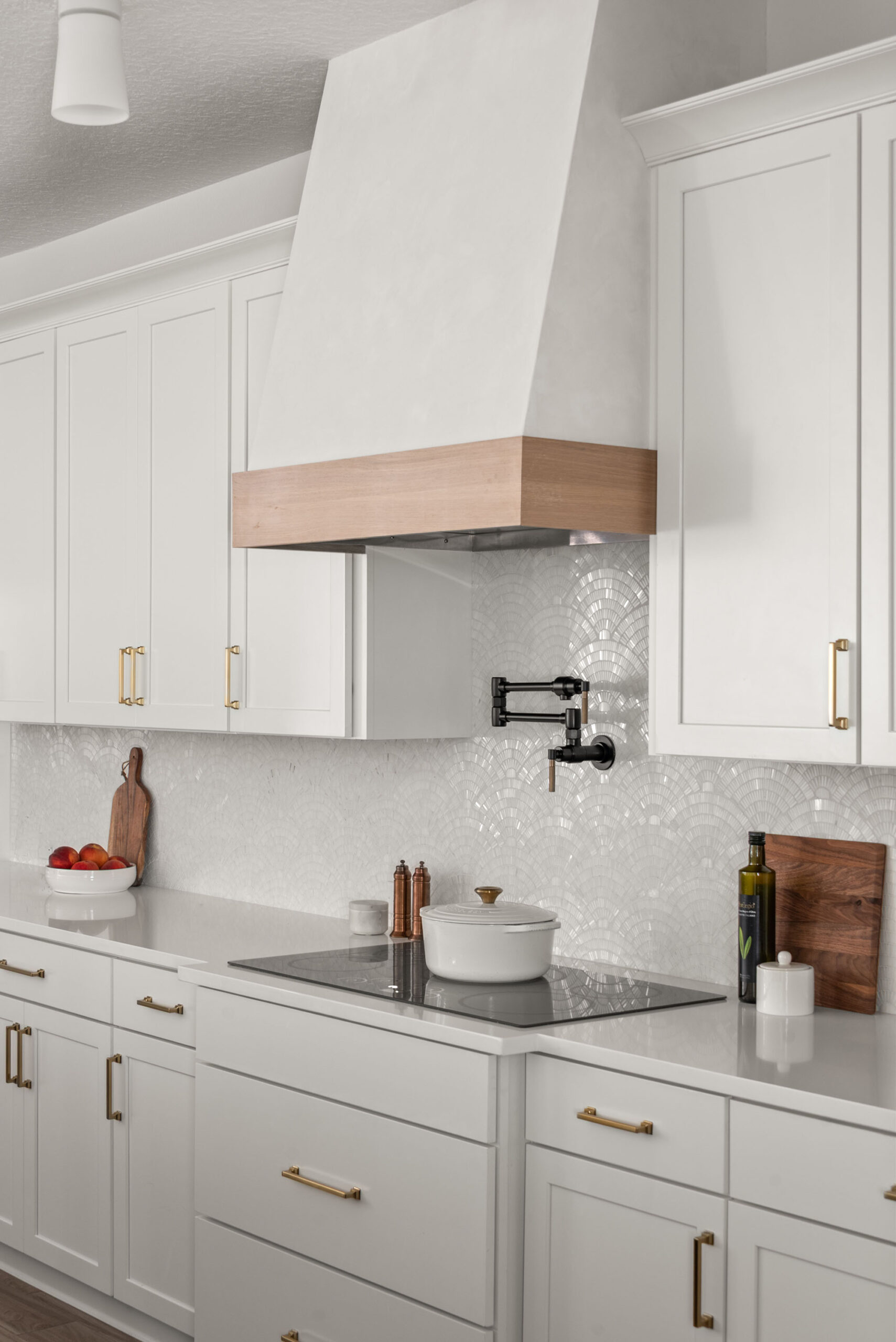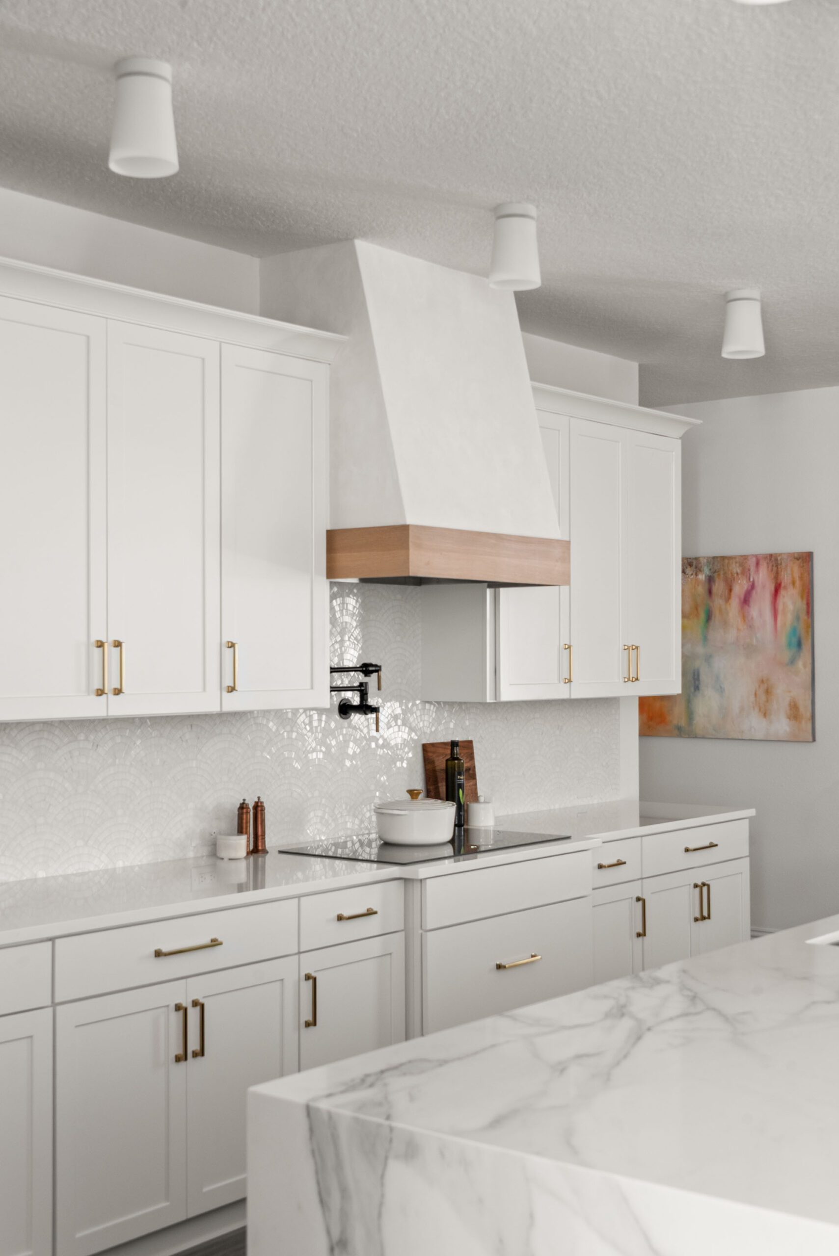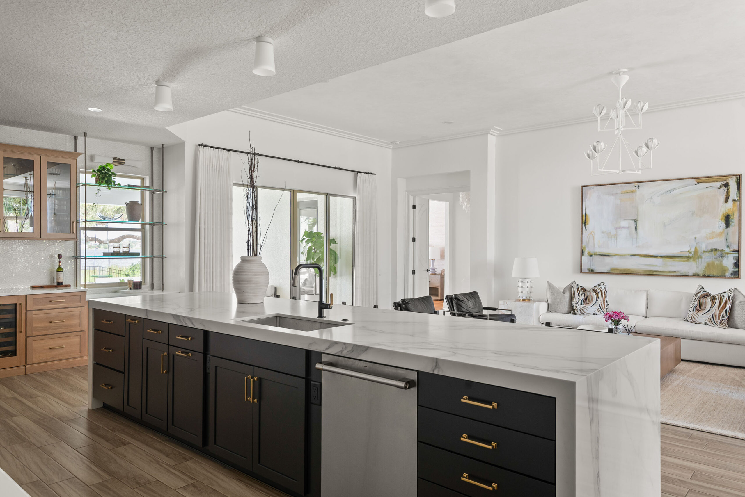 The new kitchen features a striking quartz waterfall island, offering generous seating for family and guests while anchoring the open-concept space. Clean-lined white cabinetry with brass hardware is complemented by a sculptural custom range hood and a textured mosaic backsplash that adds depth and sophistication. Dark cabinetry on the island grounds the space with contrast, while thoughtful lighting creates a warm, welcoming ambiance.