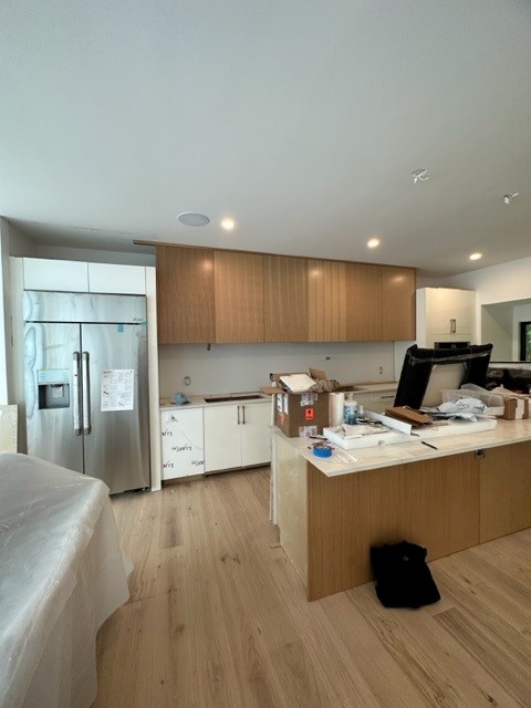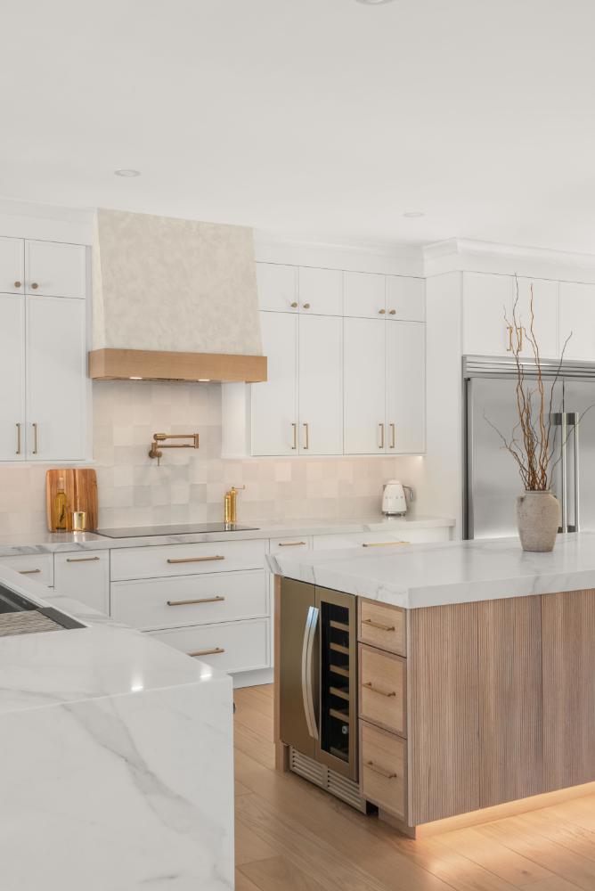 This was such a fun kitchen to design! This lovely home has soaring windows that overlook Lake Maitland in Winter Park, allowing for beautiful and abundant natural light (as well as stunning views) to flow throughout the home. Our mission was to make the view inside the home as gorgeous as the one outside! This kitchen has so many special details that elevate its design. Starting with the reeded wood detail at the foot of the waterfall edge on the quartz-clad peninsula, moving to the arched open-shelving that adds architectural interest to an otherwise ordinary space, circling around to the plaster finish on the range hood, and then to the built-in cocktail height table at the back of the island, the space just keeps on giving!