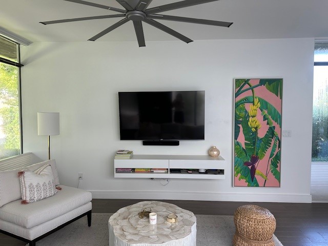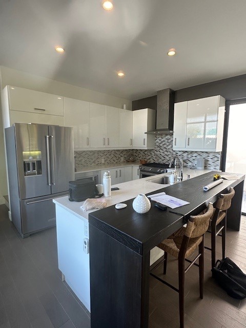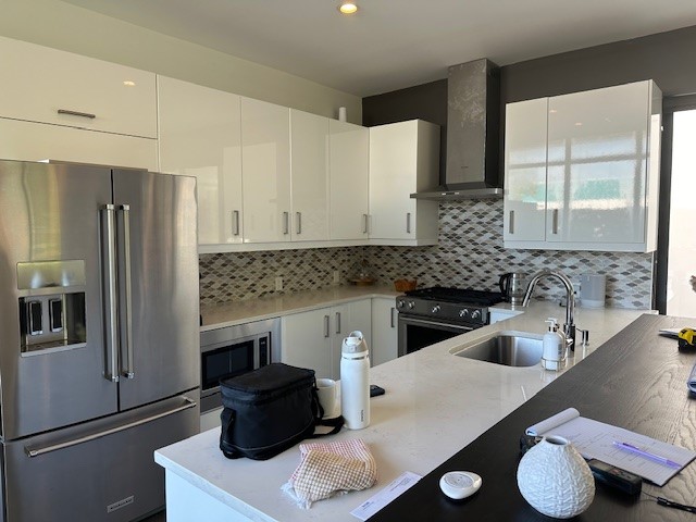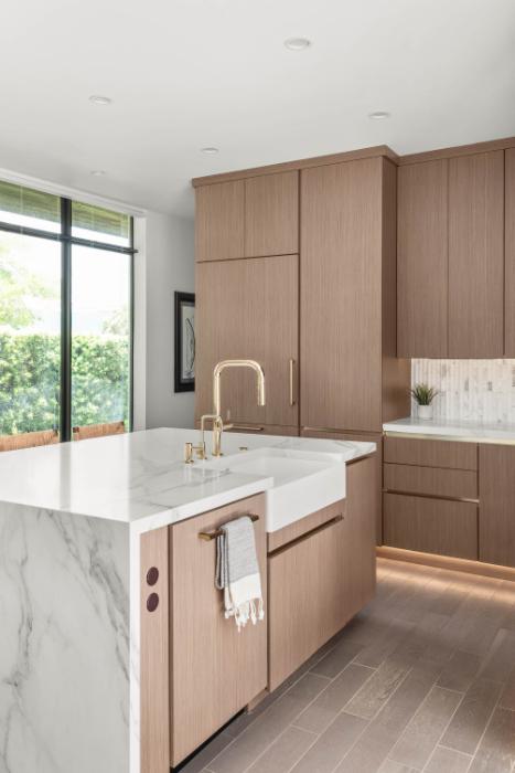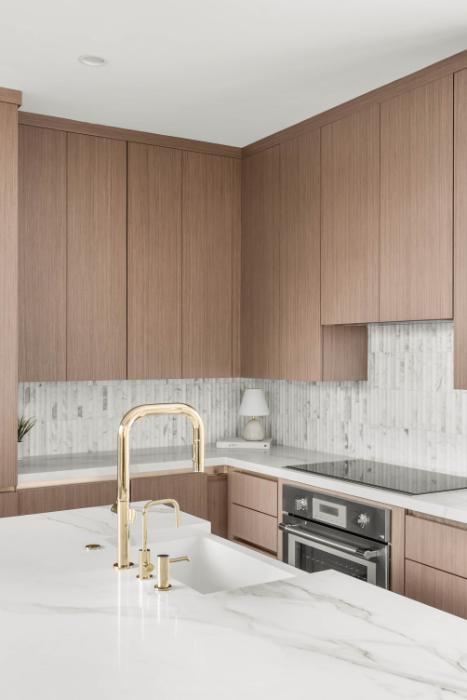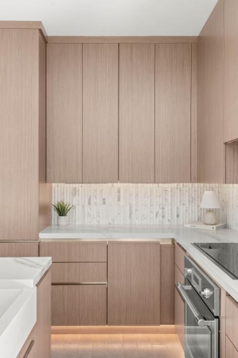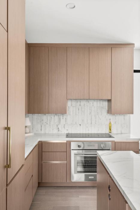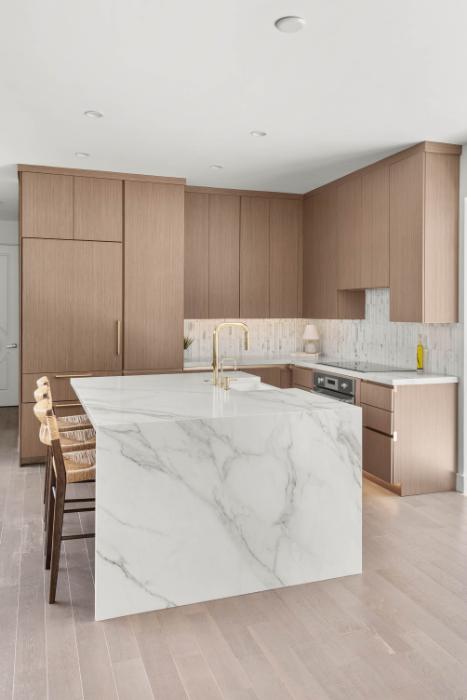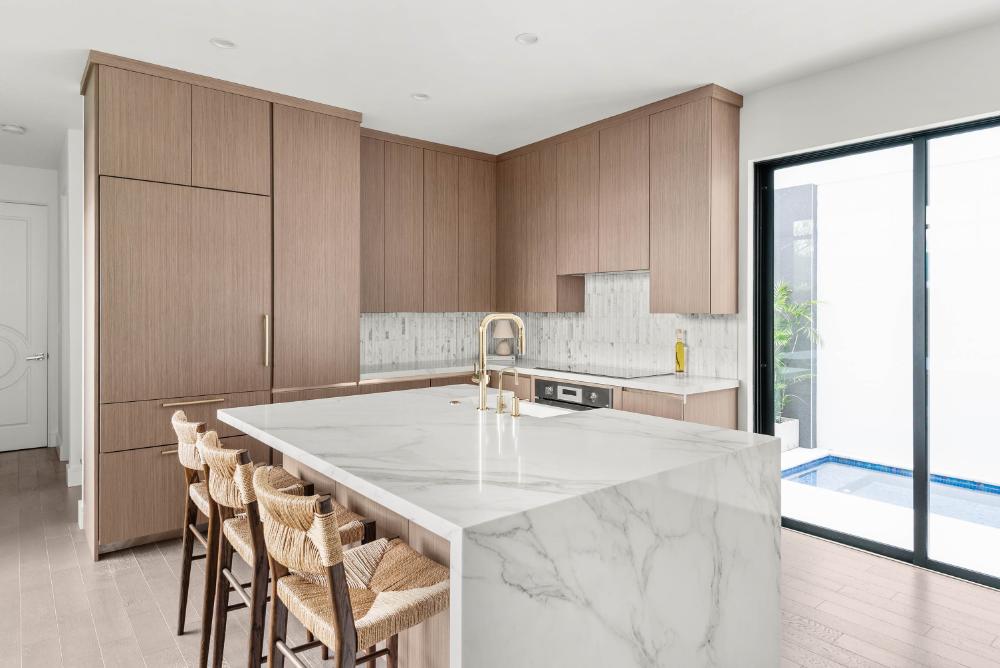 The new quartz waterfall-edge island now anchors the kitchen with sculptural elegance — a modern focal point that sets the tone for the entire home. Warm walnut cabinetry continues from the kitchen into the custom entertainment wall, adding depth and continuity throughout the open-concept living area. Minimalist hardware, a fluted marble tile backsplash, and geometric wallpaper offer layered texture and understated sophistication.