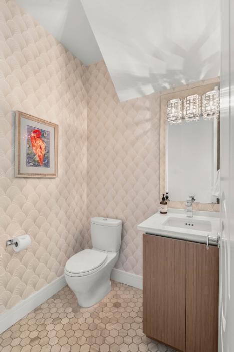 To complete the look, the nearby powder room mirrors the same finishes, extending the cohesive, custom-designed aesthetic.