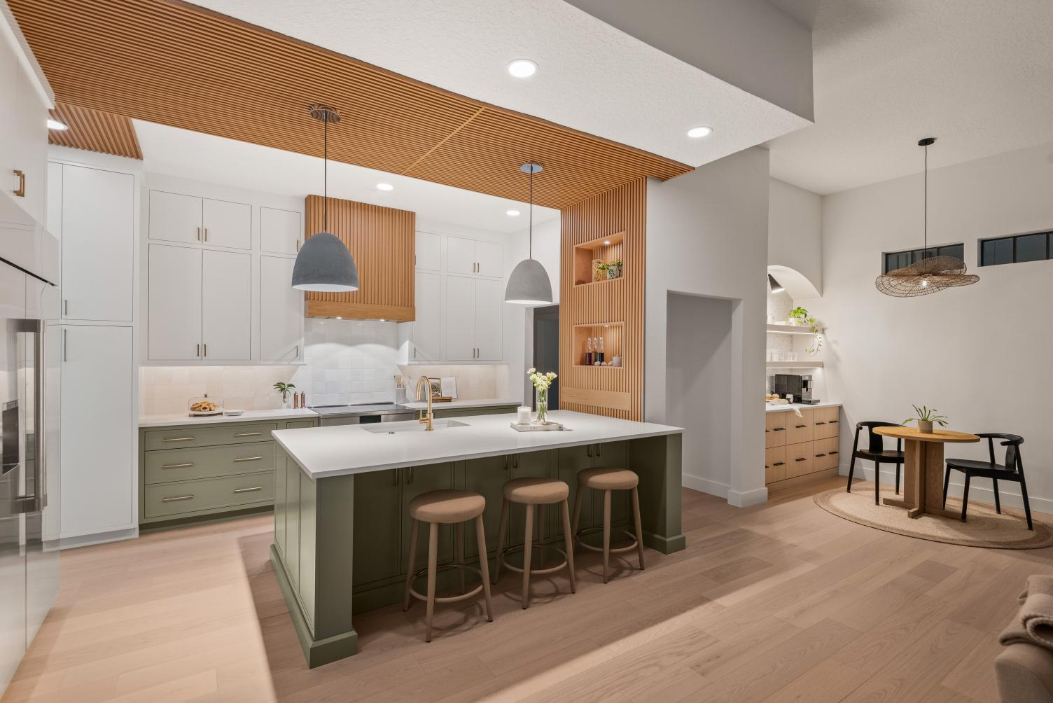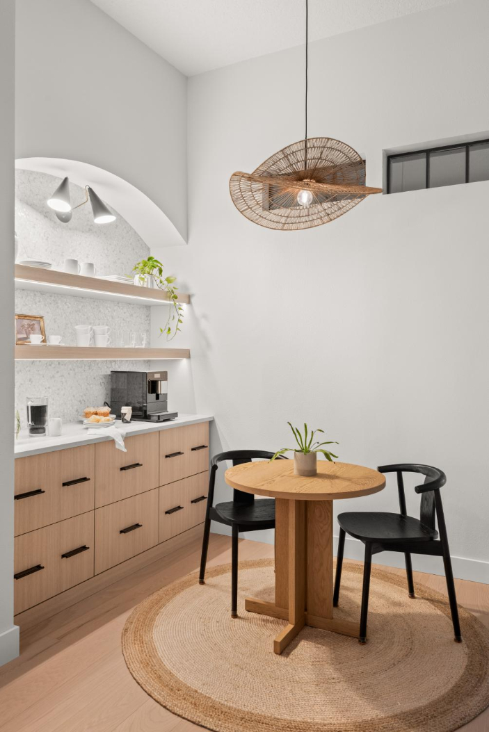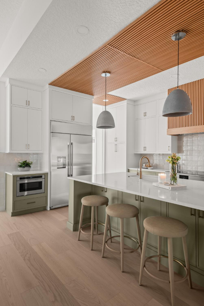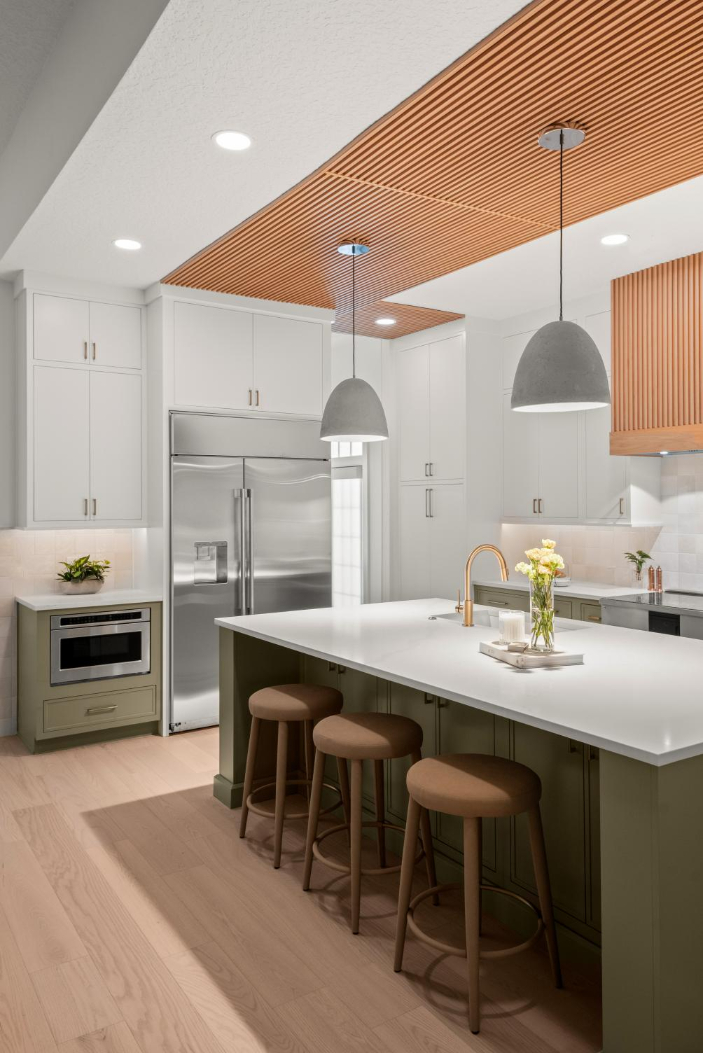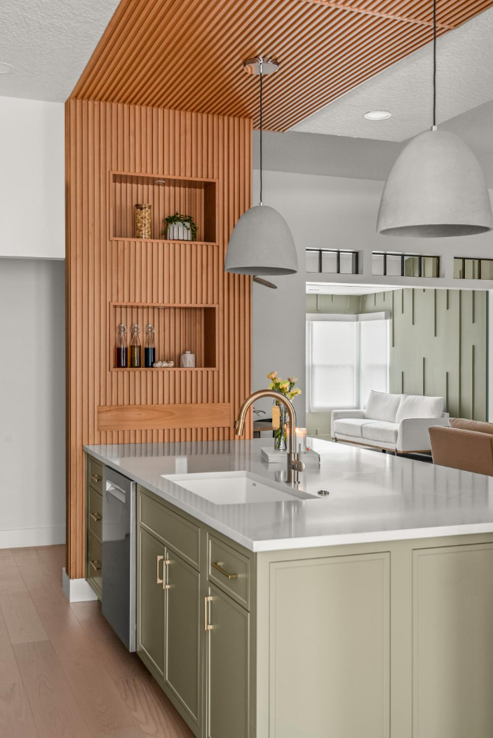 In the kitchen, we incorporated a unique wood ceiling installation for visual interest and warmth. A charming arched coffee bar nook, sage green sunroom walls, and the calming, spa-like primary bathroom continue the earthy, welcoming tone throughout the home.