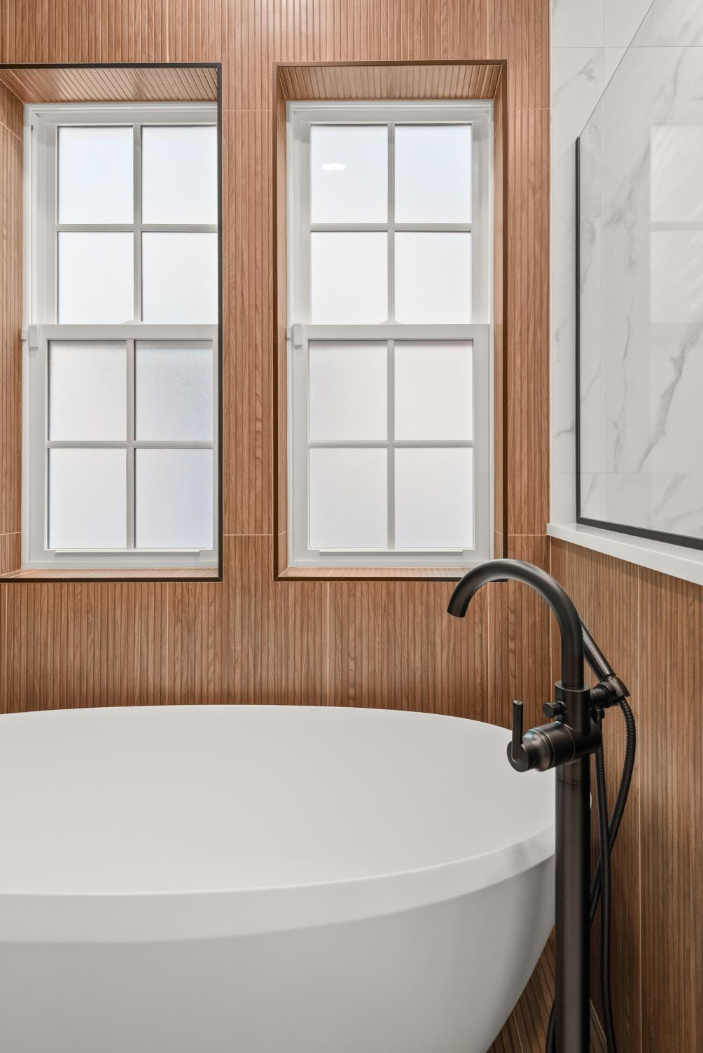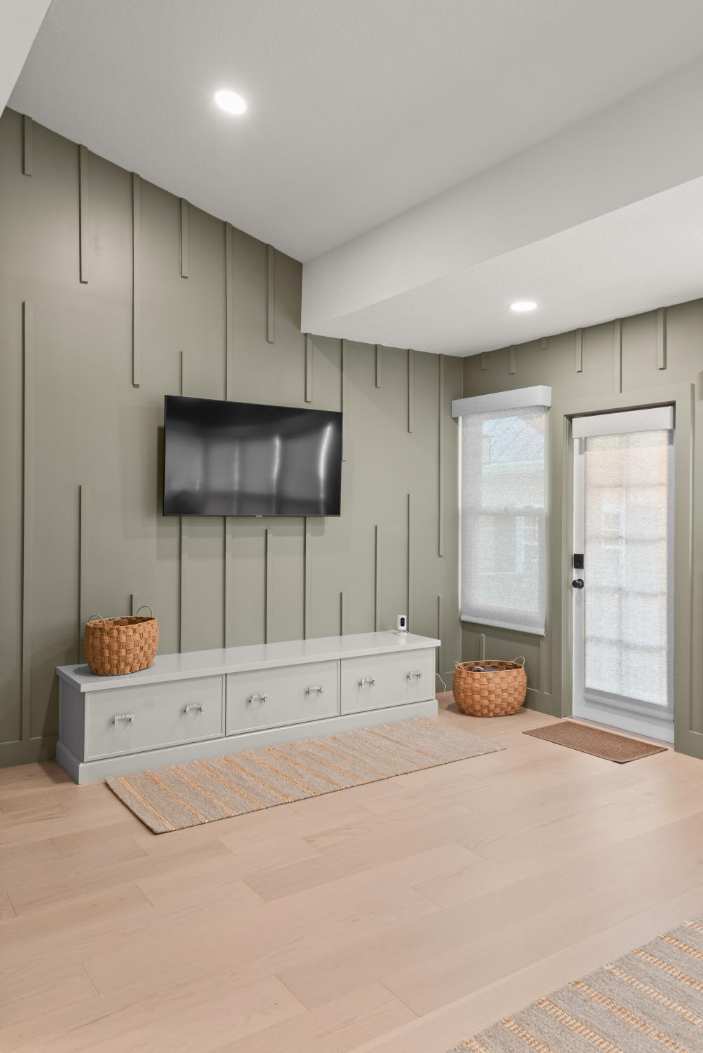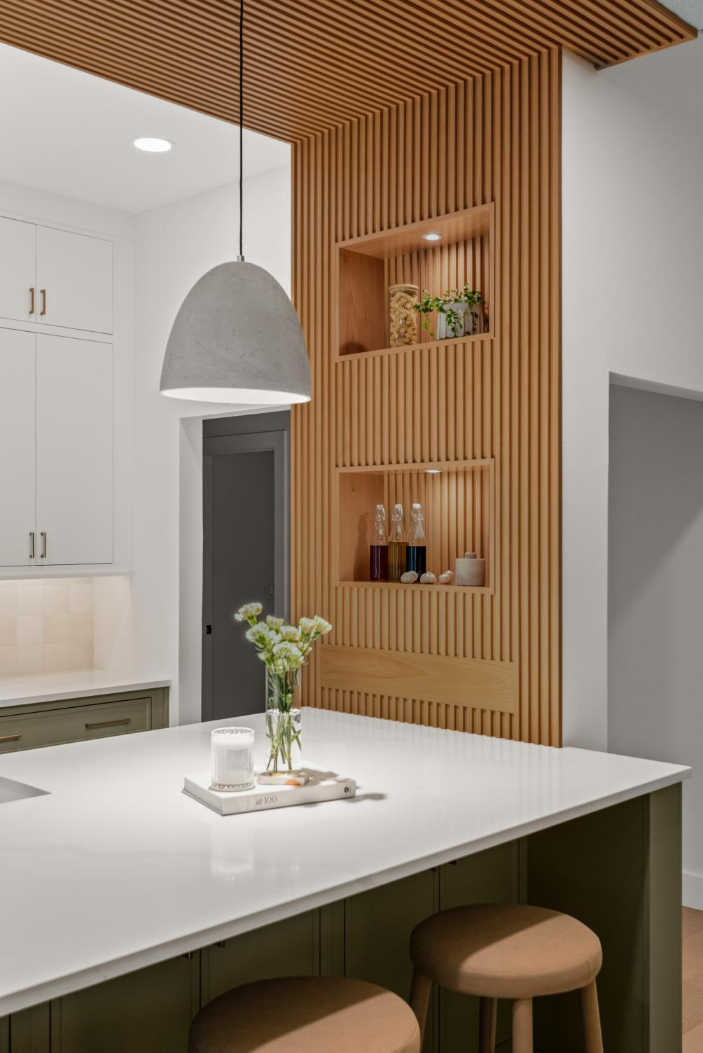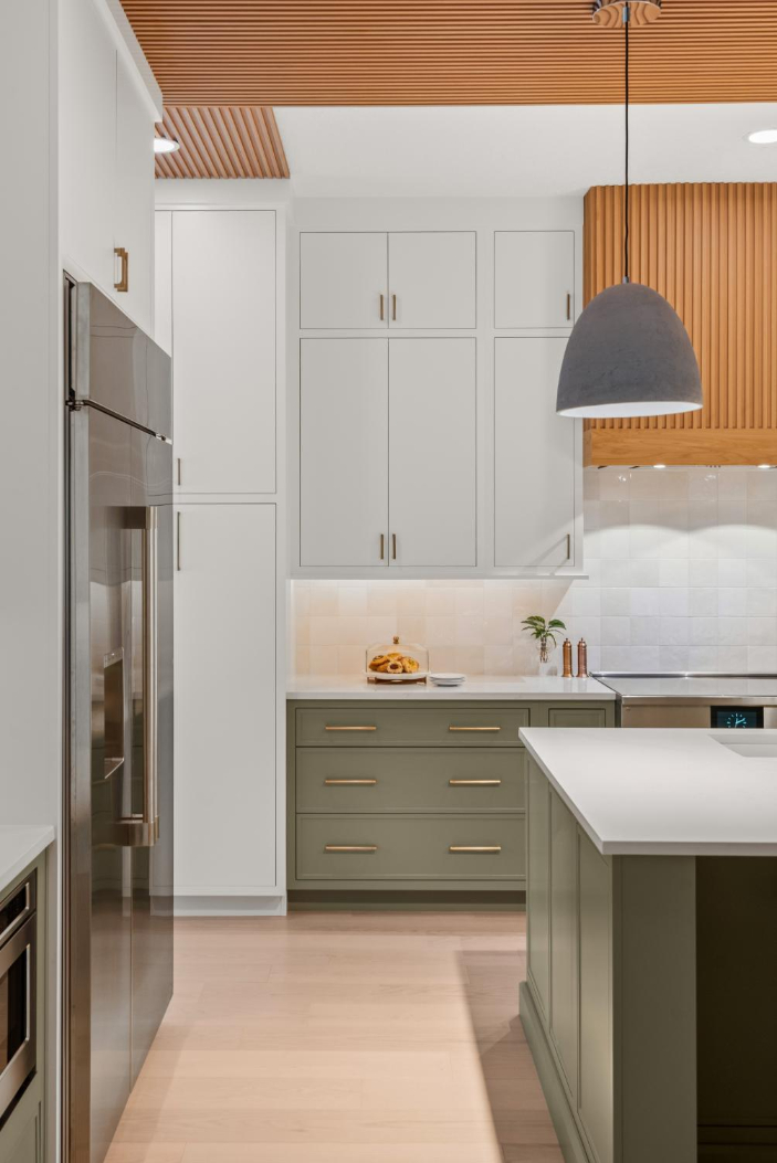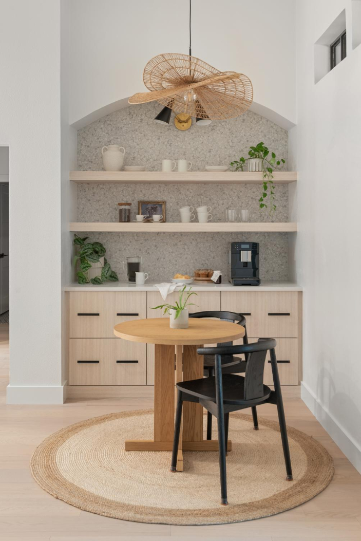 In the kitchen, we incorporated a unique wood ceiling installation for visual interest and warmth. A charming arched coffee bar nook, sage green sunroom walls, and the calming, spa-like primary bathroom continue the earthy, welcoming tone throughout the home.