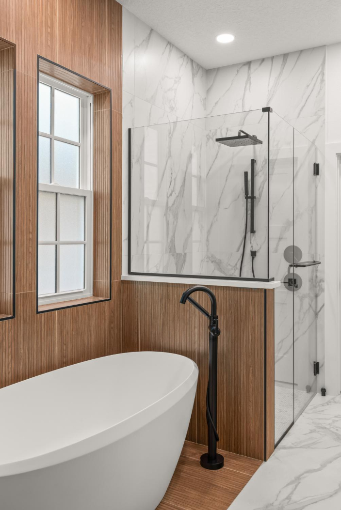 Every detail—from light fixtures and wallpaper to wall tile, fireplace stone, and wide-plank flooring—was chosen with intention to reflect the homeowners’ personal style and desire for comfort with refinement.
