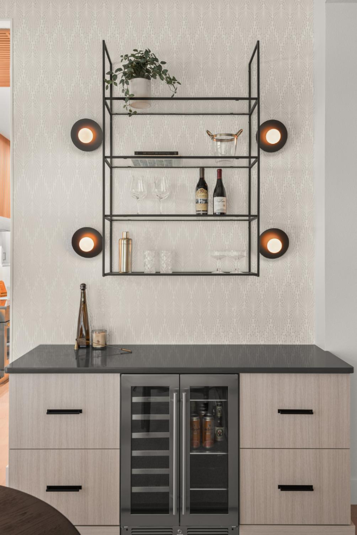 From the sleek custom bar and floating shelves in what was once the formal dining room, to the arched door leading into the home office, every space was thoughtfully reimagined. (Don’t miss the ceiling in the office—a bold treatment of contrasting tweed squares as a stylish nod to a business suit.)